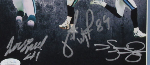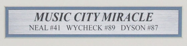 The Music City Miracle Autographed/Signed Kevin Dyson, Lorenzo Neal, Frank Wycheck Philadelphia Eagles 8x10 Photo Framed. The outer frame size is 16 inches x 18 inches. This photo is authenticated byJSA and includes their Tamper-proof Hologram Sticker and Certificate of Authenticity.