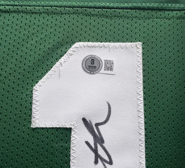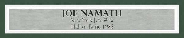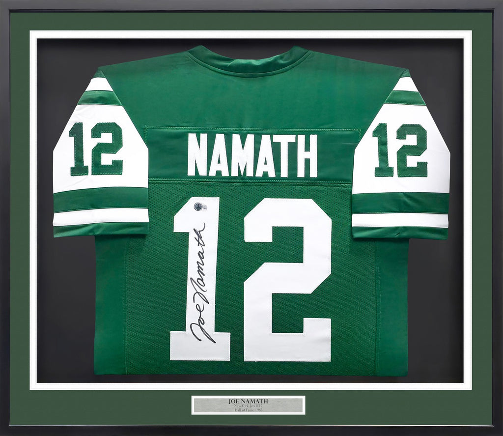 This is a framed Green Jersey, approximately 31x36 with the frame, that has been hand signed by Joe Namath. This is a custom jersey with no name brand. The approximate size is XL. It has nice sewn in name and numbers. This item has been witnessed and certified authentic by Beckett Authentication (BAS) and comes with their tamper-proof witness hologram.