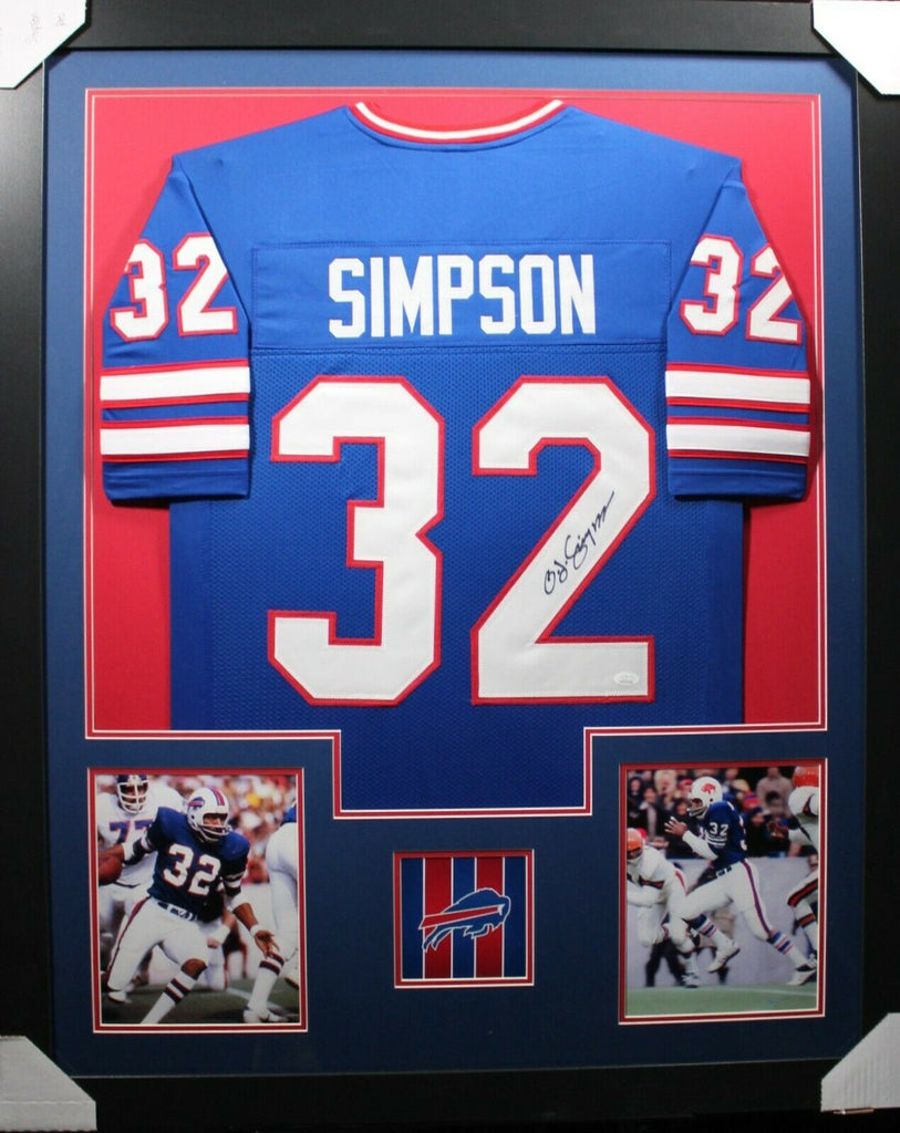 OJ SIMPSON AUTOGRAPHED & PROFESSIONALLY FRAMED PRO-STYLE JERSEY(Occasionally our own stock pictures are used at times due to quantity of framing, all frames will look identical as the one pictured)Item is accompanied with a Certificate of Authenticity issued by JSA and corresponding tamper proof hologram on the jersey.THE FRAMED JERSEY MEASURES 35"x 44" & COMES WITH THE FOLLOWING:-UV Protected Acrylic-Triple Acid Free Team Colored Matting-2 High Quality 8"x10" Photos-Team Logo