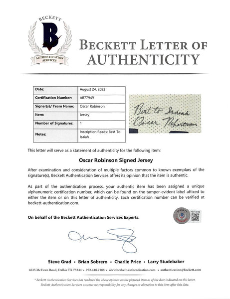 This Autographed Framed Jersey with the inscription of "Best To Isaiah" has been Personally Signed by Oscar Robertson. This item is 100% Authentic to include a Certificate of Authenticity (COA) / hologram by Beckett Authentication Services. The authenticity can be verified on Beckett Authentication Services website. This item has been professionally framed to overall dimensions of approximately 41.5 x 45.25 inches. This is a X-Large sized Framed Jersey.