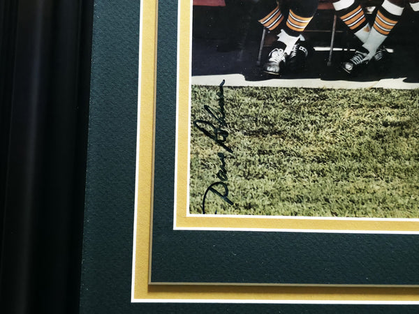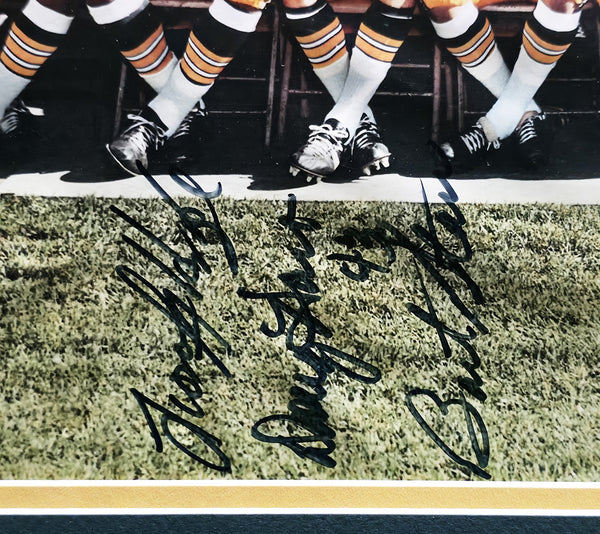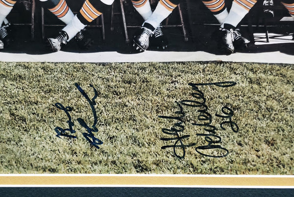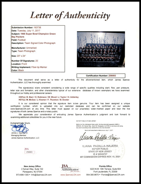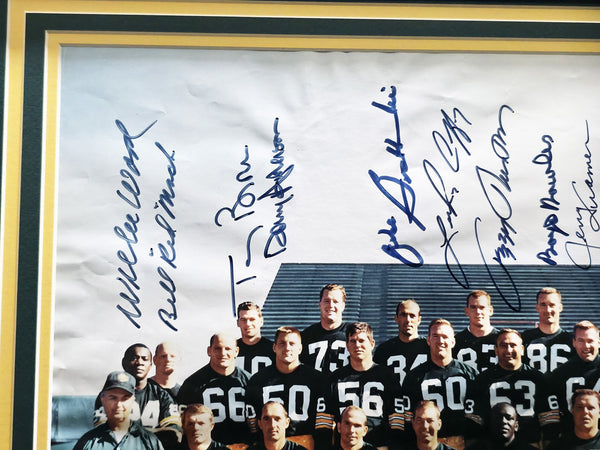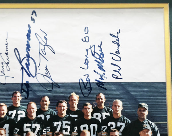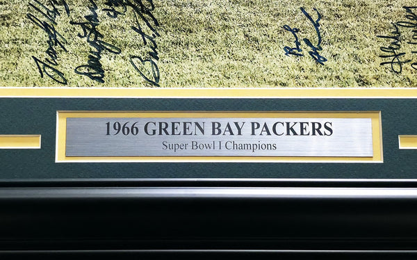 This is a Framed 16x20 Photo, approximately 24x28 with the frame, that has been hand signed by members of the 1966 Green Bay Packers Super Bowl I Champions. Signatures include Bart Starr, Dave Robinson, Willie Wood, Jim Taylor, Herb Adderley, Marv Fleming, John McGee, Jerry Kramer, Fuzzy Thurston, and Boyd Dowler. There are creases in the item as shown. This item has been certified authentic by JSA and comes with their tamper-proof hologram and matching full-page certificate of authenticity.