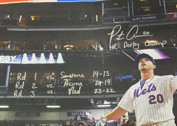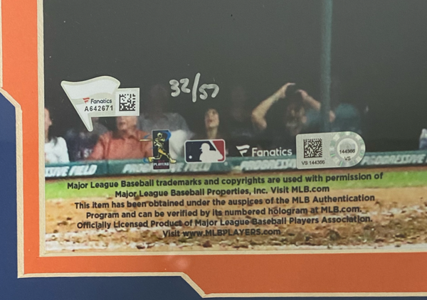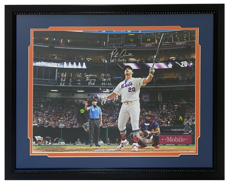 This 16" x 20" photograph has been personally hand-signed by Pete Alonso. Alonso added the round by round inscriptions to this framed photograph. It has been obtained under the auspices of the Major League Baseball Authentication Program and can be verified by its numbered hologram at MLB.Com. It also comes with an individual numbered, tamper-evident hologram from Fanatics Authentic. This process helps to ensure that the product purchased is authentic and eliminates any possibility of duplication or fraud.This photo is limited to 57 and you are bidding on number "32"This is a 16" x 20" photograph framed to total dimensions of 20" x 24"