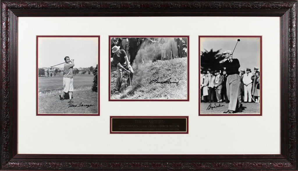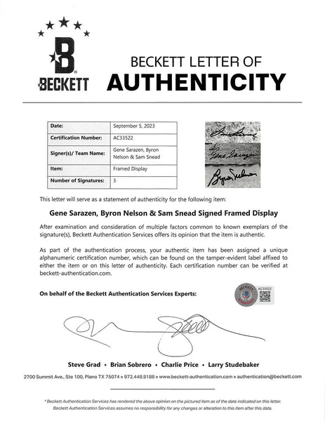 This Autographed Framed Display has been Personally Signed by Gene Sarazen, Byron Nelson & Sam Snead. This item is 100% Authentic to include a Certificate of Authenticity (COA) / hologram by Beckett Authentication Services. The authenticity can be verified on Beckett Authentication Services website. This item has been professionally framed to overall dimensions of approximately 20.5 x 35 inches.