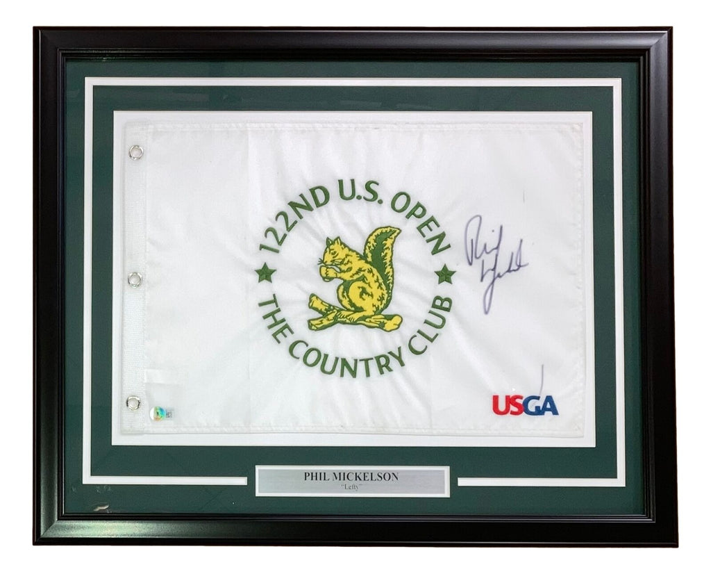 Featured is a Phil Mickelson signed US Open Championship golf flag. This flag has been hand signed by Mickelson and comes with the Beckett hologram and certificate of authenticity. This flag has been professionally framed and matted and is approximately 22x27. This flag would make a great addition to any sports memorabilia collection! SPECIFICATIONS Autographed By: Phil Mickelson Team: Sport: Golf-PGA Authentication: Beckett Grading Services