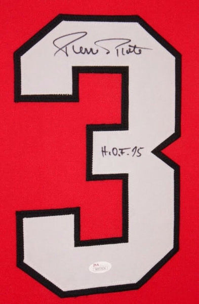 Custom frame measures approximately 35" x 43" in size and features a jersey which has been hand-signed in black felt-tip pen by Pierre Pilote (HOF). The autograph includes an official James Spence Authentication (JSA) hologram for authenticity purposes. The signing of this item was witnessed by JSA.Authentication: JSA Hologram
