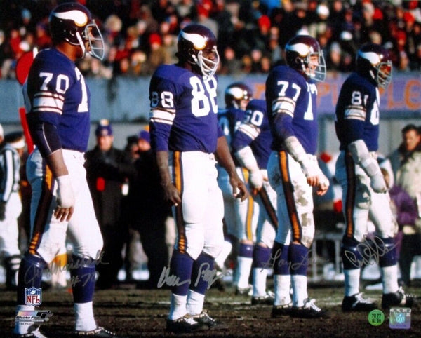 Custom frame measures approximately 35" x 43" in size and features a jersey which has been hand-signed in silver paint pen by "The Purple People Eaters" Alan Page (HOF), Carl Eller HOF), Jim Marshall. & Gary Larsen.The lot / autograph(s) includes an official Beckett Authentication Service (BAS) hologram for authenticity purposes. The signing of this item was witnessed by Beckett.Authentication: Beckett Hologram