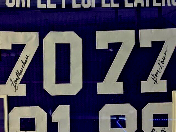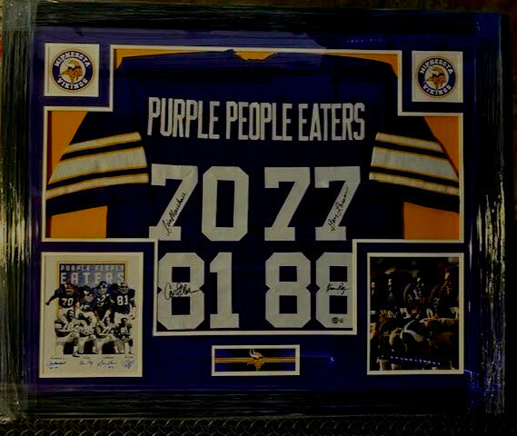 Custom frame measures approximately 35" x 43" in size and features a jersey which has been hand-signed in silver paint pen by "The Purple People Eaters" Alan Page (HOF), Carl Eller HOF), Jim Marshall. & Gary Larsen.The lot / autograph(s) includes an official Beckett Authentication Service (BAS) hologram for authenticity purposes. The signing of this item was witnessed by Beckett.Authentication: Beckett Hologram