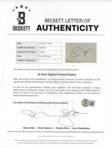 This Autographed 3x5 Index Card Framed Display has been Personally Signed by Al Davis of the Oakland Raiders. This item is 100% Authentic to include a Certificate of Authenticity (COA) / hologram by Beckett Authentication Services. The authenticity can be verified on Beckett Authentication Services website. This item has been professionally framed to overall dimensions of approximately 19.5 x 25 inches.