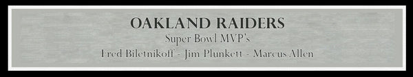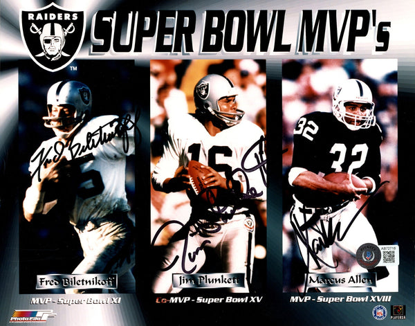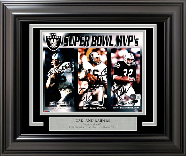 This is a Framed 8x10 Photo that has been hand signed by Marcus Allen, Jim Plunkett & Fred Biletnikoff. This item has been certified authentic by Beckett Authentication (BAS) and comes with their tamper-proof sticker and matching full-page certificate of authenticity.