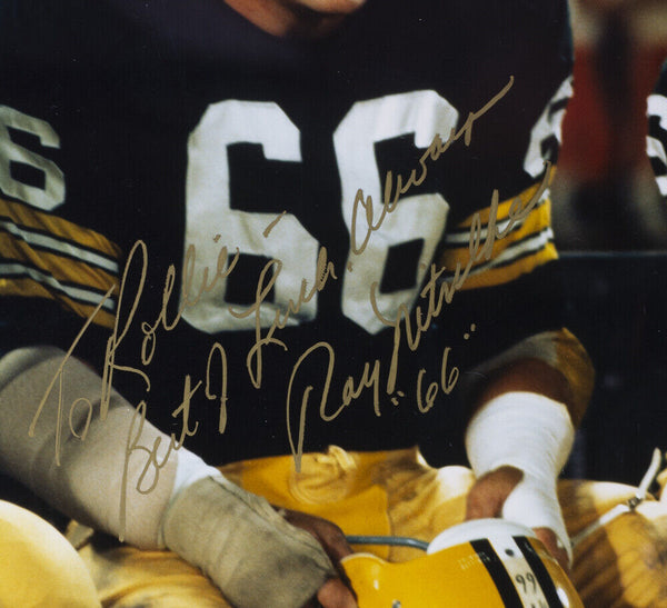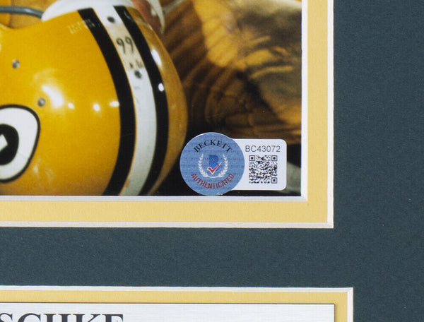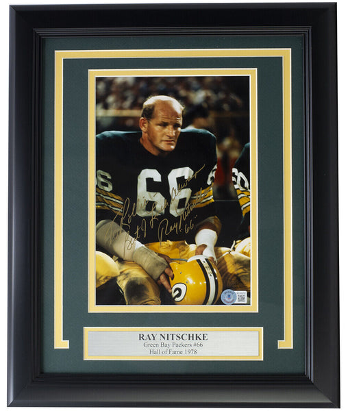 Featured is a Ray Nitschke signed and framed 8x10 Green Bay Packers football photo. This photo was hand signed by Ray Nitschke and has been authenticated by Beckett authentication services. Included with the photo is a Beckett hologram and certificate of authentication Brand new professional framing featuring double matting and engraved nameplate. The frame measures approximately 14x11 in total size, and it is ready for display. This item would make a great addition to any sports memorabilia collection. SPECIFICATIONS Autographed By: Ray Nitschke Team: Green Bay Packers Sport: Football Authentication: Beckett Grading Services