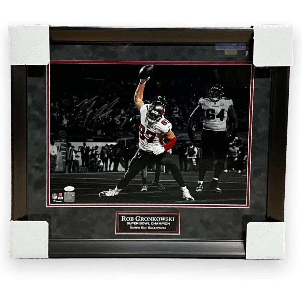 This 16x20 photo custom framed to 20x24 has been personally hand signed by Rob Gronkowski of the Tampa Bay Buccaneers 100% AuthenticCertificate of Authenticity by JSAExact location of signature may vary