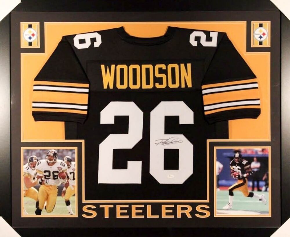 Custom framed display measures 35" x 43" in size. Features a jersey which has been hand-signed in black by Rod Woodson. The lot / autograph(s) includes an official James Spence Authentication (JSA) hologram and matching COA for authenticity purposes. The signing of this item was witnessed by JSA.Authentication: JSA COA