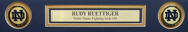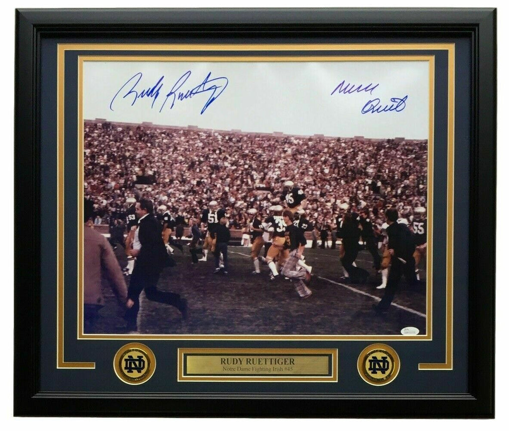 Featured is a Rudy Ruettiger autographed 16x20 photo inscribed "Never Quit". This photo has been professionally framed and matted and is approximately 22x27. This photo is hand signed by Rudy Ruettiger comes with the JSA hologram and certificate of authenticity. Rudy is a 1993 American sports film directed by David Anspaugh. It is an account of the life of Daniel Rudy Ruettiger, who harbored dreams of playing football at the University of Notre Dame despite significant obstacles. It was the first movie that the Notre Dame administration allowed to be shot on campus since Knute Rockne, All American in 1940.. SPECIFICATIONS Autographed By: Team: Notre Dame Sport: Football-NFL Authentication: Professional Sports Authenticator (PSA)