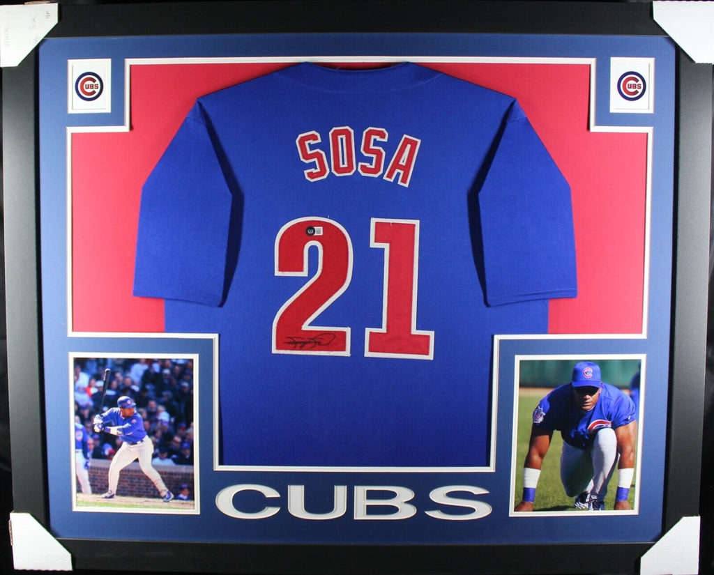 SAMMY SOSA AUTOGRAPHED & PROFESSIONALLY FRAMED PRO-STYLE JERSEY(Occasionally our own stock pictures are used at times due to quantity of framing, all frames will look identical as the one pictured)THE FRAMED JERSEY MEASURES 35"x 44" & COMES WITH THE FOLLOWING:-UV Protected Acrylic-Triple Acid Free Team Colored Matting-2 High Quality 8"x10" Photos-Team LogoEvery framed autographed jersey is accompanied with a tamper-proof hologram on the signed part of the jersey from one of the main authenticators in the industry (JSA, Beckett, PSA, etc.) and can be verified on their corresponding websites to prove authenticity.ATTENTION:If there's any damage during shipping then please message us immediately and save the box!DO NOT OPEN A RETURN OR DISPUTE PLEASE!We will provide a return label to send the frame back so we can fix any issues right away and ship it right back to you, free of charge of course!WE DO NOT OFFER PARTIAL REFUNDS TO FIX LOCALLY AS EVERYTHING IS FRAMED/FIXED IN HOUSE- Thank you -