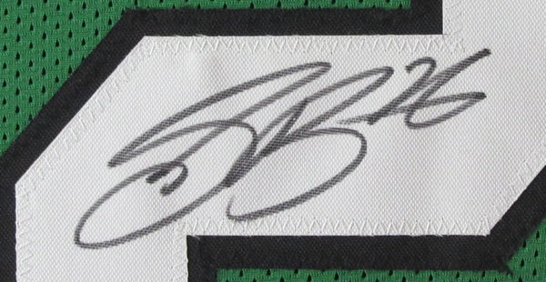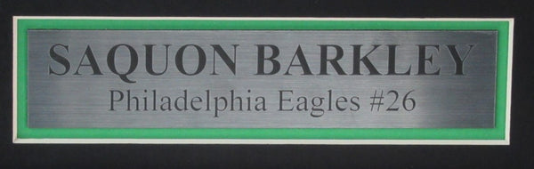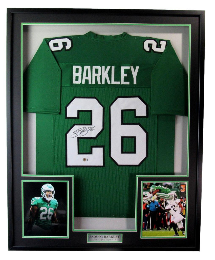Saquon Barkley Signed/Autographed Kelly-Green Philadelphia Eagles Football Jersey with Photos Framed. The outer frame size is 33 inches x 42 inches. This jersey is authenticated by BAS/Beckett Witness and includes their Tamper-proof Hologram Sticker.