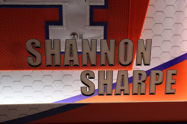 This premium display features a Shannon Sharpe autographed Denver Broncos orange custom jersey, professionally framed in a custom LED lighted shadow box. The signature appears boldly on the number "4" and is authenticated by Beckett (COA sticker shown on jersey). Framing highlights: Vibrant LED lighting enhances presentation Framing dimensions: 33.5" x 33.5" Includes vintage Broncos "D" logo, Sharpe action photo, and 3D nameplate Classic orange jersey with stitched name and numbers Shannon Sharpe is a Broncos Hall of Famer and NFL legend -- this piece is a perfect tribute to his career and a must-have for collectors or die-hard fans. Authentication: Beckett COA Condition: Excellent; clean frame and working lighting