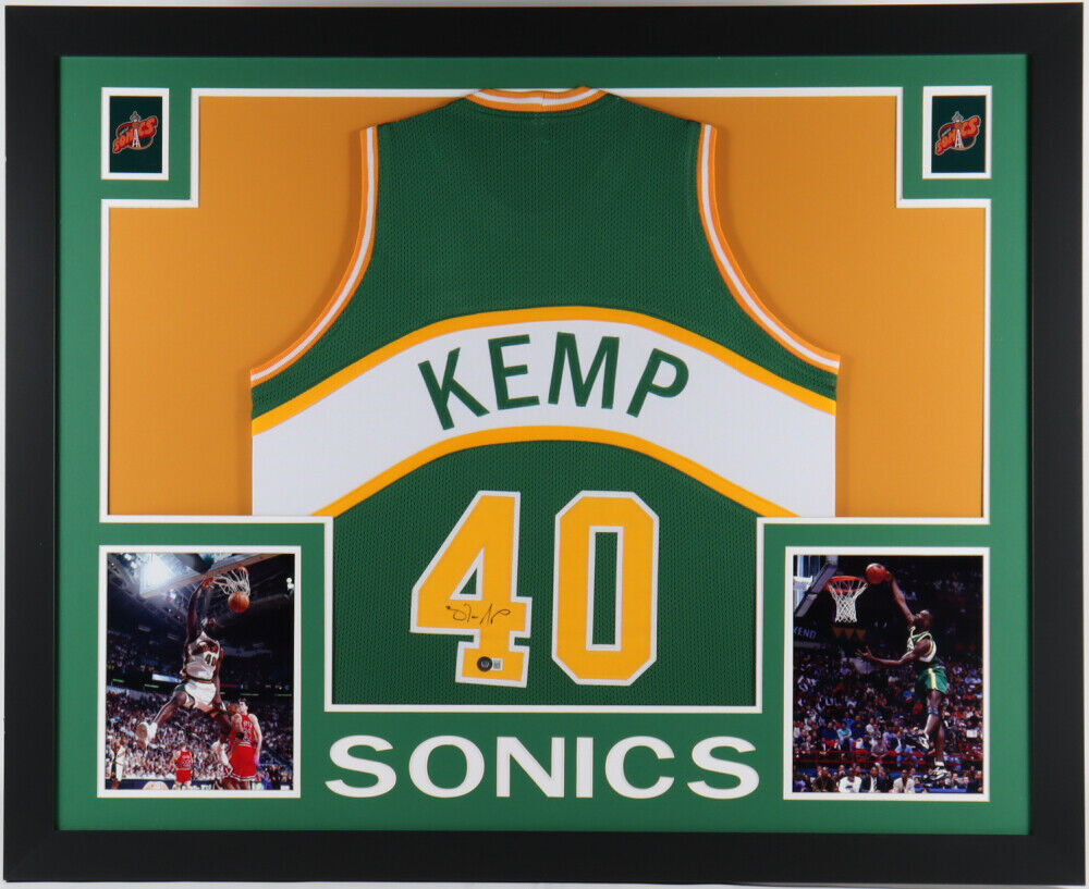 Custom frame measures 35" x 43" in size and features a jersey that has been hand-signed by Shawn Kemp.The lot / autograph(s) includes an official Beckett Authentication Services serially numbered hologram for authenticity purposes.Authentication: Beckett Hologram