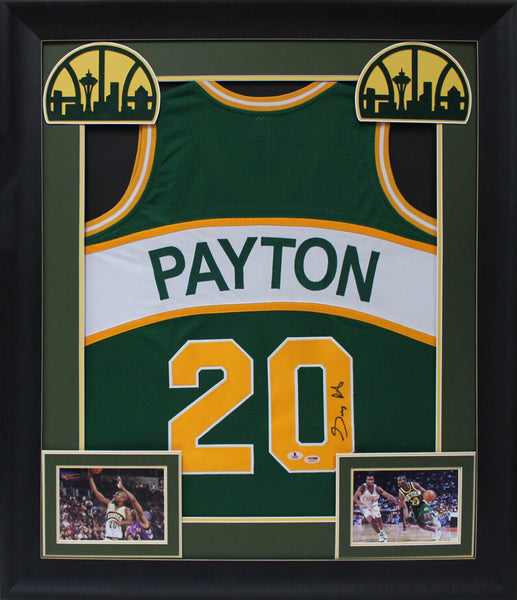 This Autographed Green Framed Jersey has been Personally Signed by Gary Payton of the Seattle Supersonics. This item is 100% Authentic to include a hologram by Beckett Authentication Services. This item may come with the new Beckett Authentication hologram that has a scannable QR code rather than the traditional COA. If you would like to have a COA, you are welcome to reach out to Beckett for a printed certification once you receive your item. This is a BAS Witnessed Protection Program item which means a Beckett Authentication Service representative was present when this item was being signed. This is a stock item in which we have several available. While the photographs are representative of this item, the size, placement and strength of the signature may vary. Each item is hand signed, therefore, each autograph is unique. This item can be verified through BAS Witnessed. This item has been professionally framed to overall dimensions of approximately 32 x 37 inches. This is a X-Large sized, non-branded, custom-stitched Framed Jersey. This jersey will be framed to order, it will take 3-4 days from purchase date for it to ship.