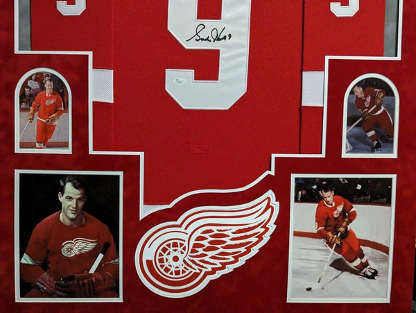 Custom Framed in SUEDE Gordie Howe hand signed Detroit Red Wings style custom jersey. JSA COA This signature is authenticated by a representative of JSA! 100% AUTHENTIC!!! The jersey has fully stitched numbers on the front and back. It is a great item and a must for all great sports fans! This item is professionally framed, it measures 32"x40" inside , 42"x34" outside , using UV protective Acrylic glass for safe keeping and safe transport, SUEDE team color matting, black moulding and hanging hooks on the back. All additional items in frame seen in pictures included. 100% ready to hang in your fan cave.