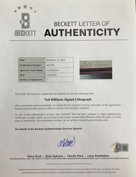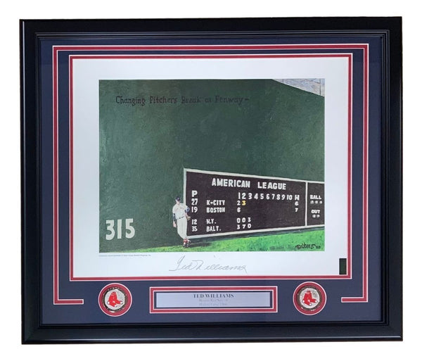Featured is a Ted Williams signed 16x20 Boston Red Sox photo. This photo has been hand signed by Williams and comes with the Beckett hologram and letter of authenticity. This photo has been professionally framed and matted and is approximately 22x27. This photo would make a great addition to any sports memorabilia collection! SPECIFICATIONS Autographed By: Ted Williams Team: Boston Red Sox Sport: Baseball Authentication: Beckett Grading Services