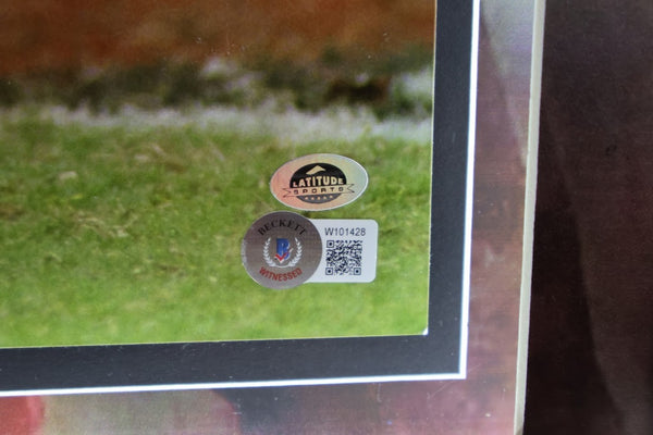 This striking display features a Terrell Davis autographed 16x20 photo, professionally framed in a custom LED lighted shadow box. The action photo shows Davis charging downfield in his prime, with a bold blue signature and added inscriptions: "#30" and "HOF 17." Authenticated by Beckett (COA sticker shown). Framing highlights: Frame size: 25.5" x 31.5" Built-in LED lighting surrounds the display for a vibrant presentation Left panel shows Davis lifting the Lombardi Trophy in Super Bowl glory "TERRELL DAVIS" and Broncos logos incorporated into the custom background Ready to hang -- a perfect gift or addition to any Broncos collection Authentication: Beckett COA Condition: Excellent; no frame damage, signature is clean, lights fully functional