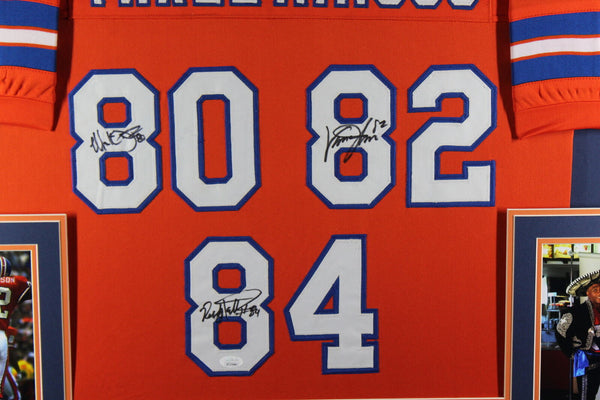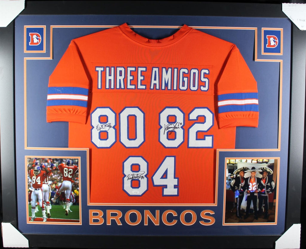 Three Amigos Signed Pro Style Framed Orange XL Jersey Beckett 40149 The number in the listing title is just an inventory sku for our records and is not the authentication number. This is the exact item that you will receive so please see pictures for condition. This is a professionally framed Three Amigos Pro Style orange jersey that was personally autographed by Vance Johnson, Mark Jackson and Ricky Nattiel. This jersey measures approximately 42" x 34" and Includes a certificate of authenticity from Beckett Authentication Services (BAS) and Denver Autographs.