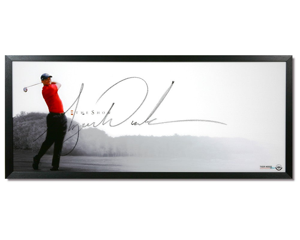 "The Show" features a custom acetate overlay of Tiger Woods with his oversized autograph that takes up approximately three squared feet of the image. It is by far the largest signature of Tiger Woods that Upper Deck has ever produced. This breathtaking 46"x20" framed display shows Tiger in his Sunday red polo following through his tee shot with a grayscale tree-lined golf course in the background. Tiger has inked his massive signature in black. The golf greats' three-foot signature was witnessed under UDA's Five-Step Authentication Process.