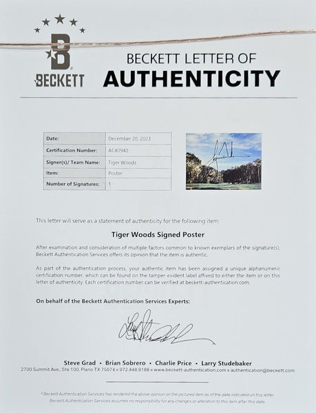 Featured is a Tiger Woods signed 16x20 poster. This poster has been hand signed by Woods and comes with the Beckett hologram and letter of authenticity. This poster has been professionally framed and matted and is approximately 22x27. This poster would make a great addition to any sports memorabilia collection! SPECIFICATIONS Autographed By: Tiger Woods Team: Sport: Golf-PGA Authentication: Beckett Grading Services