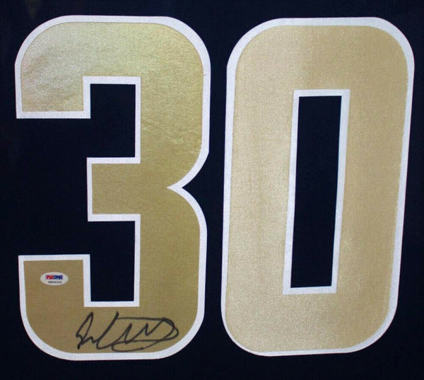 Custom frame measures approximately 35" x 43" in size and features a jersey which has been hand-signed in black felt-tip pen by Todd Gurley. The lot / autograph(s) includes an official PSA/DNA hologram for authenticity purposes. The signing of this item was witnessed by PSA.Authentication: PSA Hologram