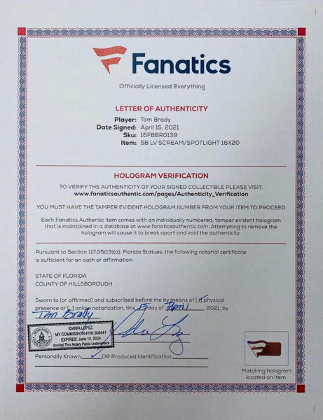 This 16" x 20" photograph has been personally hand signed by Tom Brady. It is officially licensed by the National Football League and comes with an individually numbered, tamper evident hologram from Fanatics Authentic. To ensure authenticity, the hologram can be reviewed online. This process helps to ensure that the product purchased is authentic and eliminates any possibility of duplication or fraud.The photograph is custom framed and measures 20" x 24"