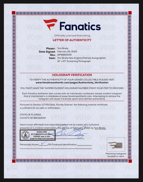 This is a Framed 16x20 Photo, approximately 24x28 with the frame, that has been hand signed by Tom Brady. This item has been certified authentic by Fanatics and comes with their tamper-proof sticker and matching full-page certificate letter of authenticity.