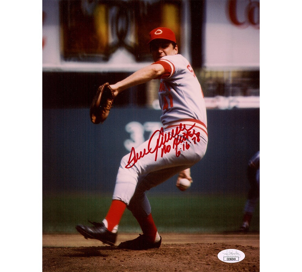 A Cincinnati Red Unframed 8x10 Pitching on Mound MLB Photo hand signed by Tom Seaver. The item and signature are in excellent condition. In addition to signing his name, Tom also inscribed "No Hitter 6-16-78" on the item. Tom is a former professional baseball player who played 20 season in the MLB as a pitcher. He is a World Champion, 12x All Star, 3x NL CY Young Award Winner and Pitched a no hitter in 1978. AUTHENTICATION: The item is accompanied by a JSA Certificate of Authenticity - JSA Serial Numbered and Databased Hologram.