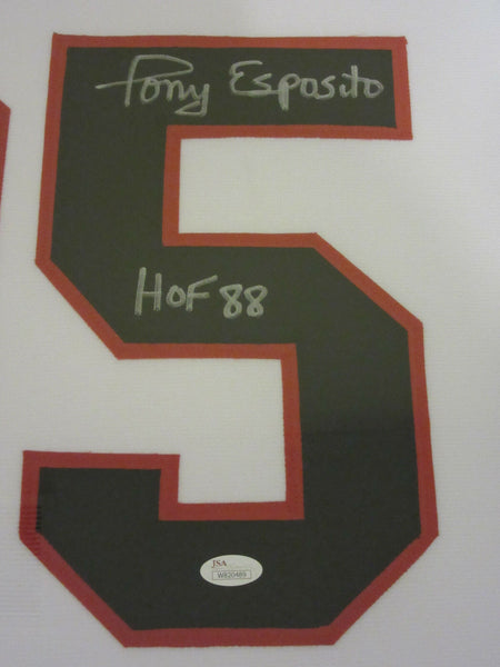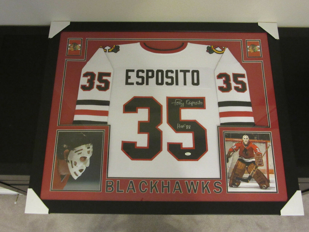 Custom frame measures approximately 35" x 43" in size and features a jersey which has been hand-signed and inscribed in silver paint pen by Tony Esposito (HOF). The autograph includes an official James Spence Authentication (JSA) hologram and matching COA for authenticity purposes. The signing of this item was witnessed by JSA.Authentication: JSA COA