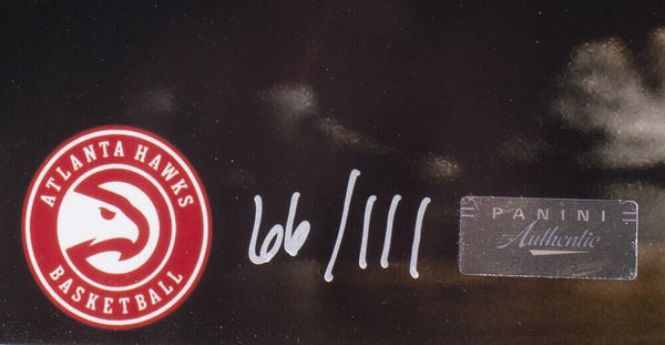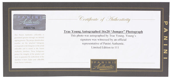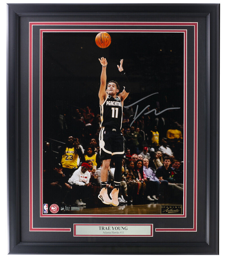 Featured is a Trae Young signed framed Atlanta Hawks limited edition x/111, 16x20 NBA photo. This photo was hand signed by Trae Young and comes with the Panini Authentic hologram and COA card. This photo is professionally framed featuring double matting and an engraved nameplate. The frame measures approximately 20x24 in total size, and it is ready for display. This item would make a great addition to any sports memorabilia collection. SPECIFICATIONS Autographed By: Trae Young Team: Atlanta Hawks Sport: Basketball Authentication: Panini Authentic