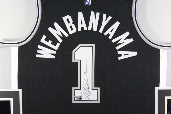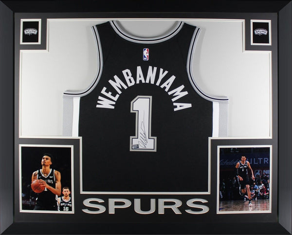 Victor Wembanyama has autographed this official San Antonio swingman jersey size XL twill # which is heat screened on. Autograph was witnessed and authenticated by Fanatics Authentic. Simply scan the QR code hologram on your item to verify authenticity on their site. Victor was the #1 overall pick of the 2023 draft. Frame measures 35x43 and comes with UV plexi glass to protect your item. Any glare in the image is just from the image being taken.