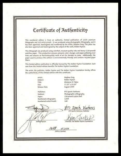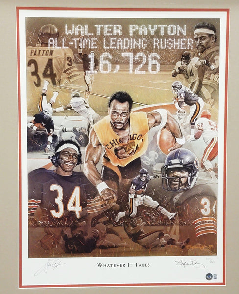 This is a Framed 18x24 Photo Collage, approximately 27x32 with the frame, that has been hand signed by Walter Payton. This item has been certified authentic by Beckett Authentication (BAS) and comes with their tamper-proof sticker and matching full-page certificate of authenticity.
