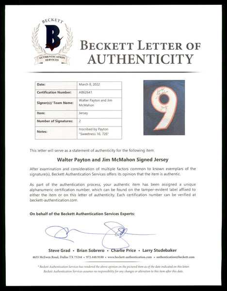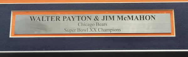 This is a framed Champion Chicago Bears Jersey, approximately 31x36 with the frame, that has been hand signed by Walter Payton & Jim McMahon. This item was inscribed "Sweetness 16,726." This item has been certified authentic by Beckett Authentication (BAS) and comes with their tamper-proof sticker and matching full-page certificate of authenticity.