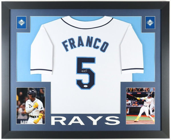 Custom on-field style jersey is framed and measures 35" x 43" in size and features a jersey hand-signed by Wander Franco.The lot / autograph(s) includes an official Beckett Authentication Services serially numbered hologram for authenticity purposes. The signing of this item was witnessed by Beckett.Authentication: Beckett Hologram