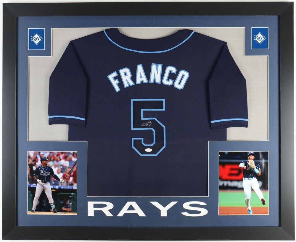 Custom on-field style jersey is framed and measures 35" x 43" in size and features a jersey hand-signed by Wander Franco.The lot / autograph(s) includes an official Beckett Authentication Services serially numbered hologram for authenticity purposes. The signing of this item was witnessed by Beckett.Authentication: Beckett Hologram