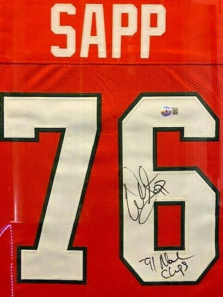 Custom frame measures approximately 36" x 39" in size and features a jersey which has been hand-signed in black Sharpie by Warren Sapp.The lot / autograph(s) includes an official Beckett Authentication Services serially-numbered hologram and QR Code card for authenticity purposes. The signing of this item was witnessed by Beckett.Authentication: Beckett Hologram with QR Code card