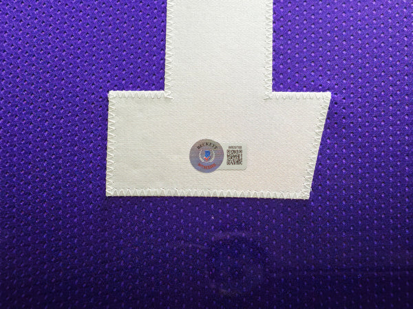 This is a framed Purple Jersey, approximately 31x36 with the frame, that has been hand signed by Rome Odunze. This item has been witnessed and certified authentic by Beckett Authentication (BAS) and comes with their tamper-proof witness hologram.
