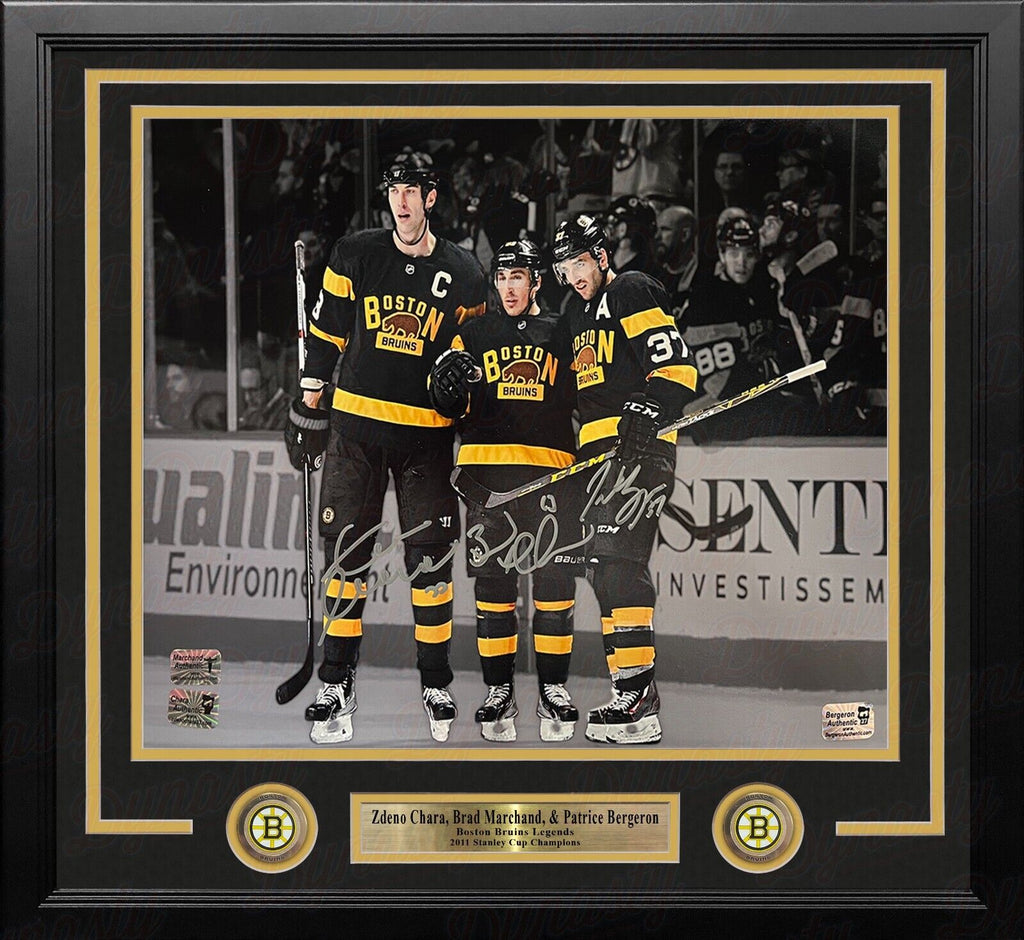 Zdeno Chara, Brad Marchand, Patrice Bergeron Boston Bruins Autographed 11x14 Framed Blackout Photo Signed picture of Bruins legends Zdeno Chara, Brad Marchand, & Patrice Bergeron; includes certificate of authenticity from all three players This hockey photo has been hand-signed by Bruins hockey legends Zdeno Chara, Brad Marchand, & Patrice Bergeron. The photo includes a hologram of authenticity from all three superstars.Hand-Signed by Boston Bruins legends Zdeno Chara, Brad Marchand, & Patrice BergeronSignatures are bold and clear on the photoPhoto has been certified by the authentication companies of all three playersFramed 11" x 14" measures 18" x 22"