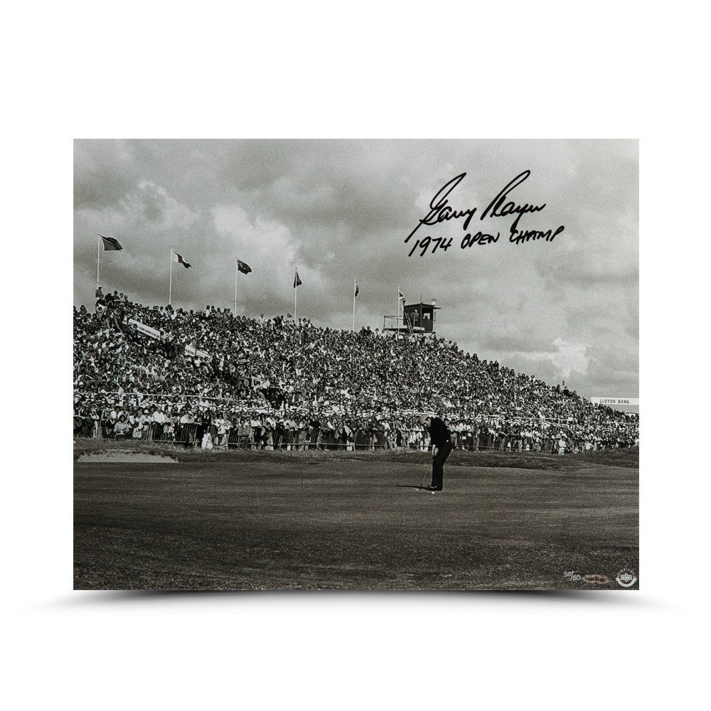 Gary Player had already captured a career Grand Slam as well as six major championships overall when he began the 1974 PGA Tour season. After capturing the Masters Tournament title in April, he went into the British Open at Royal Lytham & St. Annes Golf Club – the 103rd edition of the Open Championship – as one of the favorites, along with Jack Nicklaus, Lee Trevino and Johnny Miller. Player tied for the first-round lead then never relinquished it, shooting a 69-68-75-70—282 for a four-stroke win over hometown favorite Peter Oosterhuis. In this image, he is putting on the 18th and final hole to wrap up the championship. Player has signed and inscribed "1974 Open Champ" on this limited edition (50) Putt For The Win 16" x 20" image in black paint pen. His signature is deemed authentic by virtue of Upper Deck Authenticated's Five Step Process.