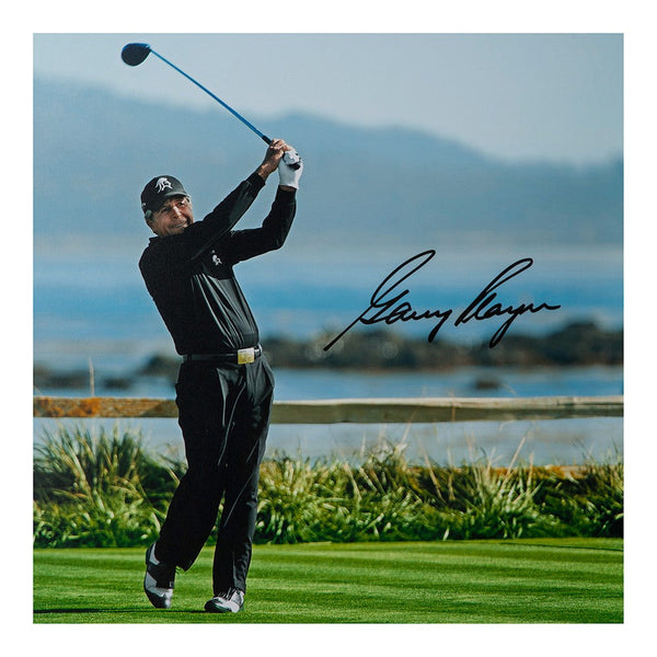 Despite winning nine majors and being considered among the greatest ever, Gary Player was more than just a championship golfer. He was a true ambassador of the worldwide sport that has become popular in nearly every corner of the earth thanks to the efforts of Player and his colleagues. He has designed more than 325 golf courses around the world. He was given the Lifetime Achievement Award by the African American Sports Hall of Fame in 2007 thanks to his work on race relations in sports. At the age of 80, he still tees off occasionally on the Champions Tour and the European Seniors Tour. Player has signed this limited edition (25) Tee Shot on 18 16" x 20" image in black paint pen. His signature is deemed authentic by virtue of Upper Deck Authenticated's Five Step Process.