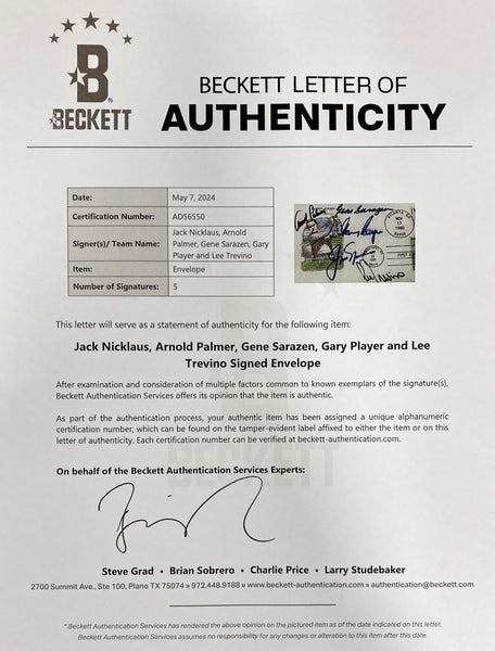 Featured is an Arnold Palmer, Jack Nicklaus, Gary Player, Gene Sarazen, and Lee Trevino signed Bobby Jones First Day Cover. This envelope has been hand signed by Palmer, Nicklaus, Player, Sarazen, and Trevino and comes with the Beckett hologram and letter of authenticity. This envelope would make a great addition to any sports memorabilia collection!. SPECIFICATIONS Autographed By: Arnold Palmer Team: Sport: Golf-PGA Authentication: Beckett Grading Services