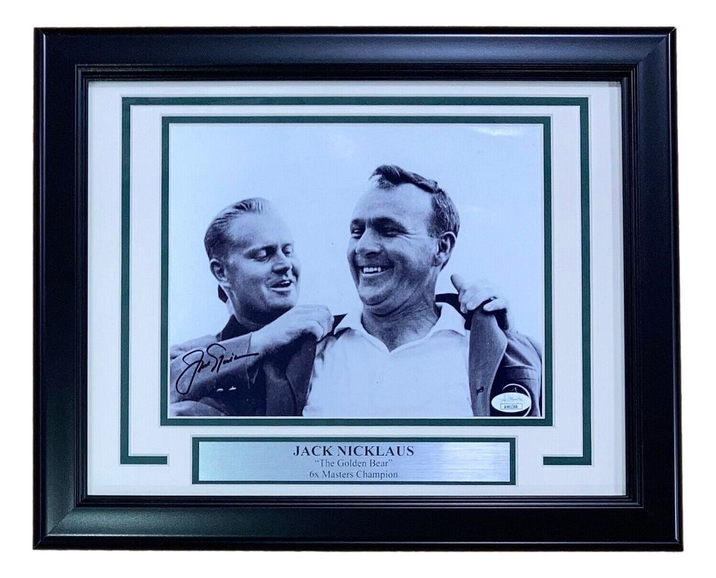 Featured is a Jack Nicklaus signed framed 8x10 golf photo. This photo was hand signed by Jack Nicklaus and authenticated by JSA authentication services. Included with the photo is a JSA hologram and certificate of authentication. This frame measures approximately 11x14 in total size, and is ready for display. This item would make a great addition to any sports memorabilia collection!. SPECIFICATIONS Autographed By: Nicklaus Team: Sport: Golf-PGA Authentication: James Spence Authentication (JSA)