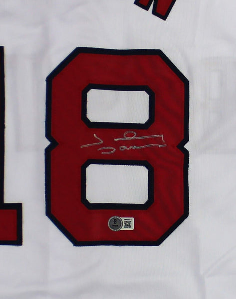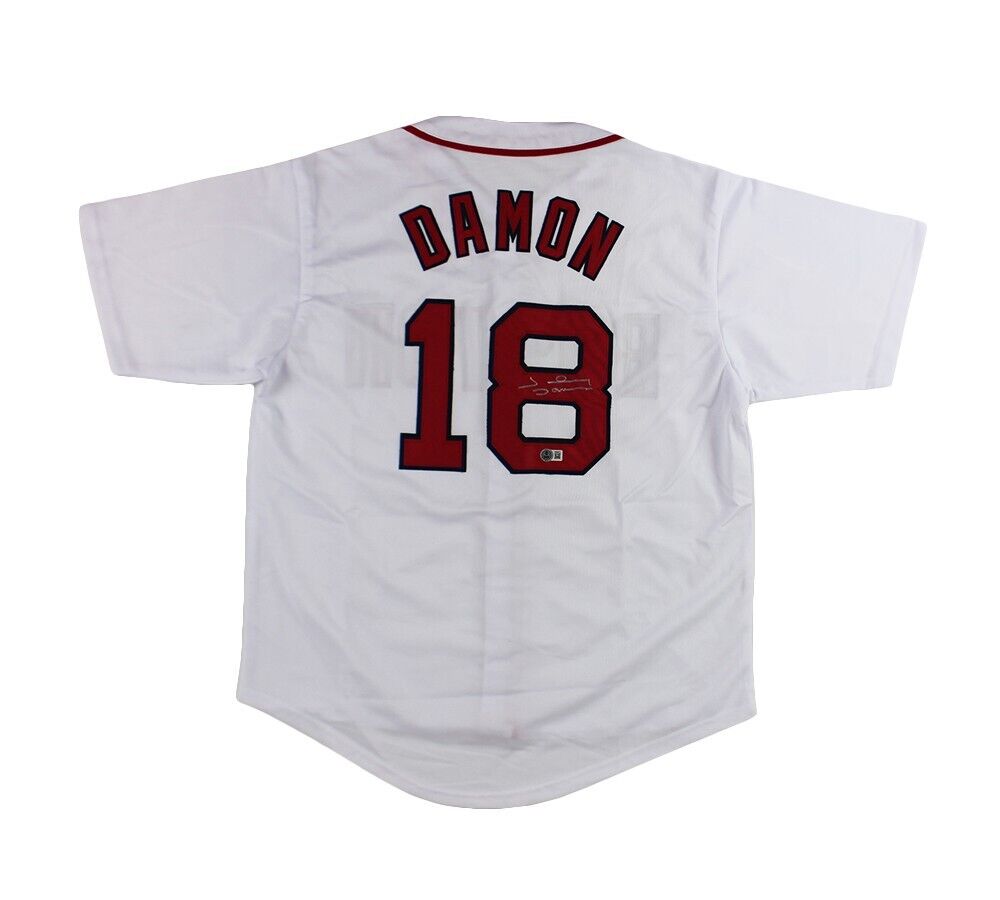 A Boston Custom White Jersey hand signed by Johnny Damon. The item and signature are in excellent condition. Johnny was an outfielder and played for the Boston Red Sox from 2002-2005. He was a 2x All-star and a 2x World Series Champion. AUTHENTICATION: The item is accompanied by a Beckett Serial Numbered & Databased Hologram