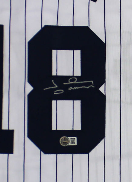 A New York Custom White Jersey hand signed by Johnny Damon. The item and signature are in excellent condition. Johnny was an outfielder and played for the Yankees from 2006-2009. He is a 2x All-star and a 2x World Series Champion. AUTHENTICATION: The item is accompanied by a Beckett Serial Numbered & Databased Hologram