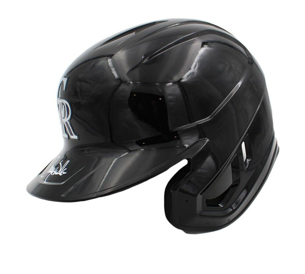 A Colorado Rockies Rawlings Mach Pro MLB Helmet hand signed by Larry Walker. The item and signature are in excellent condition. Larry is a 5x all star, he has earned 7 gold glove awards, he is also a 3x silver slugger. AUTHENTICATION: The item is accompanied by an Beckett Serial Numbered and Databased Hologram.
