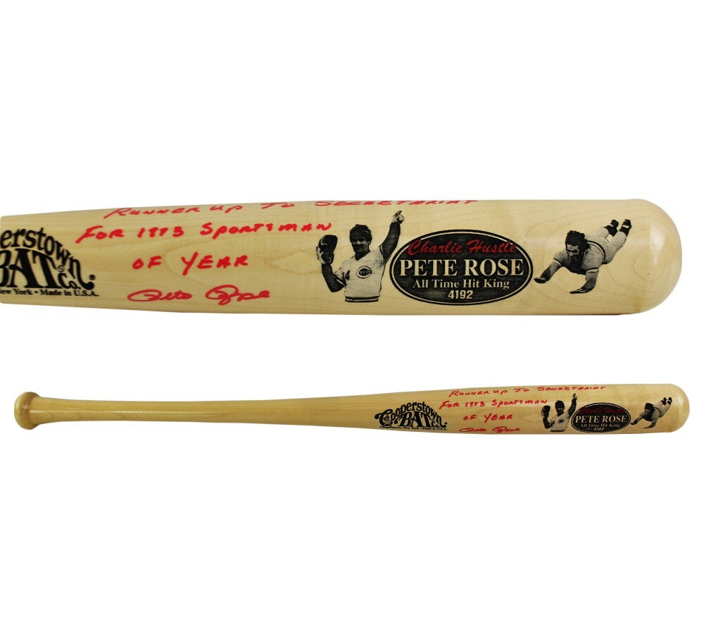 A Cincinnati Reds Cooperstown Engraved Blonde MLB Bat Hand Signed by Pete Rose. The item and signature are in excellent condition. In addition to signing his name, Pete also inscribed "Runner Up to Secretariat For 1873 Sportsman of the Year" on the item. Pete is a 17x All-Star, 3x World Series Champion, 1973 National League Most Valuable Player, 1975 World Series Most Valuable Player, 3x National League Batting Champion, 2x Gold Glove Award winner and 1963 National League Rookie of the Year. AUTHENTICATION: The item is accompanied by a JSA Certificate of Authenticity - JSA Serial Numbered and Databased Hologram